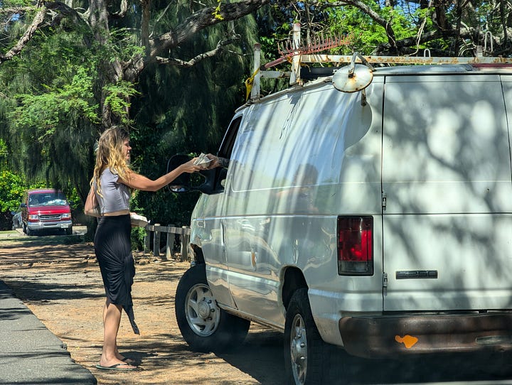 Welcome to the De-Dasher Diaries where we compare and contrast two worlds living side-by-side today: one that slowly saps the soul and drains the community and one that nourishes the soul and strengthens the community. As a driver for DoorDash and a team member and driver for Helping Hungry Heros (HHH) a mutual aide group on Maui I have walked in both worlds. The math (economic, social, and spiritual) that divides two is clear and compelling.